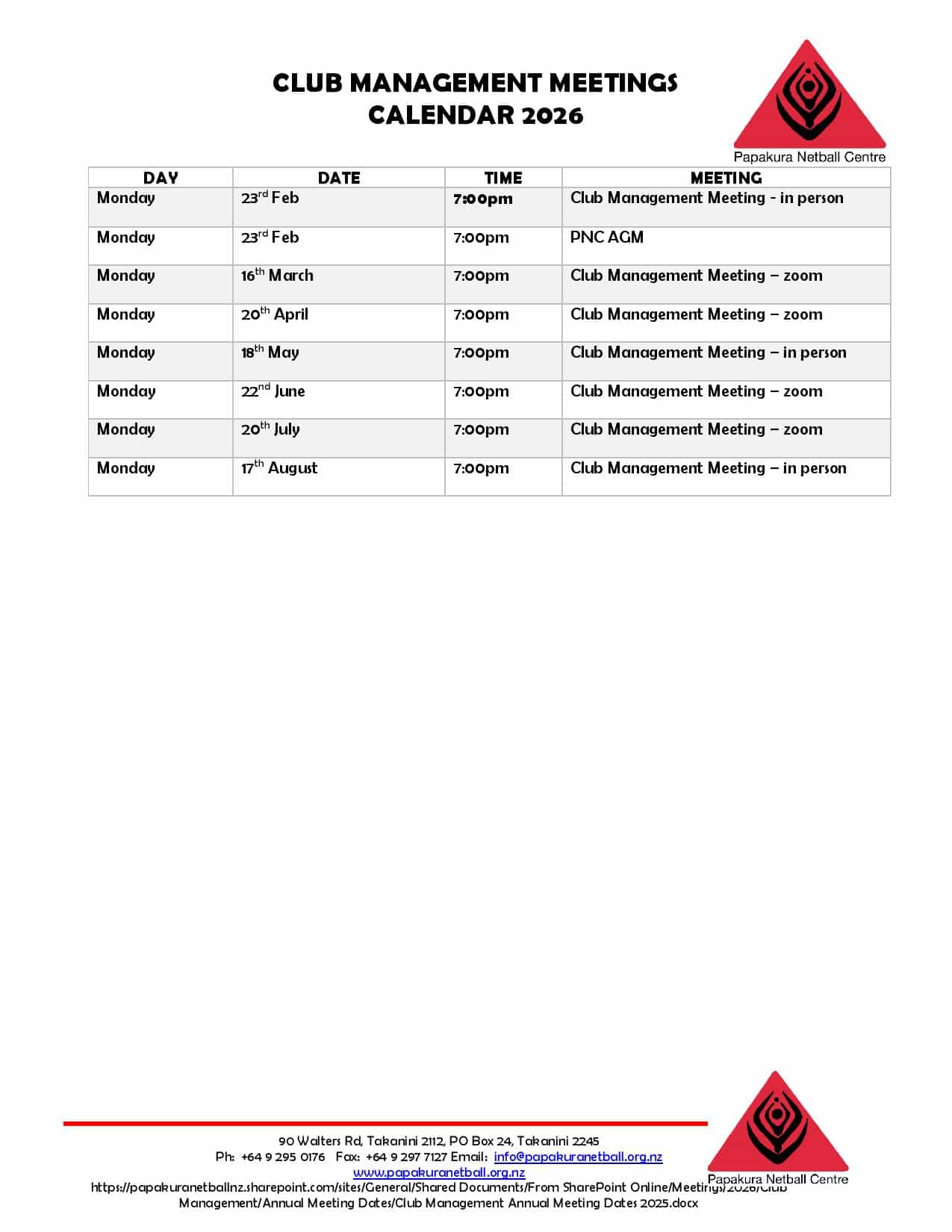 Every Month, Papakura Netball Centre holds a club management meeting to discuss things such as draws, upcoming events, tournaments, coaching and umpiring. To make sure that this information is filtering through the Club’s and their members, the Club Management Meeting minutes are loaded and stored here for you, easy to download if you like.